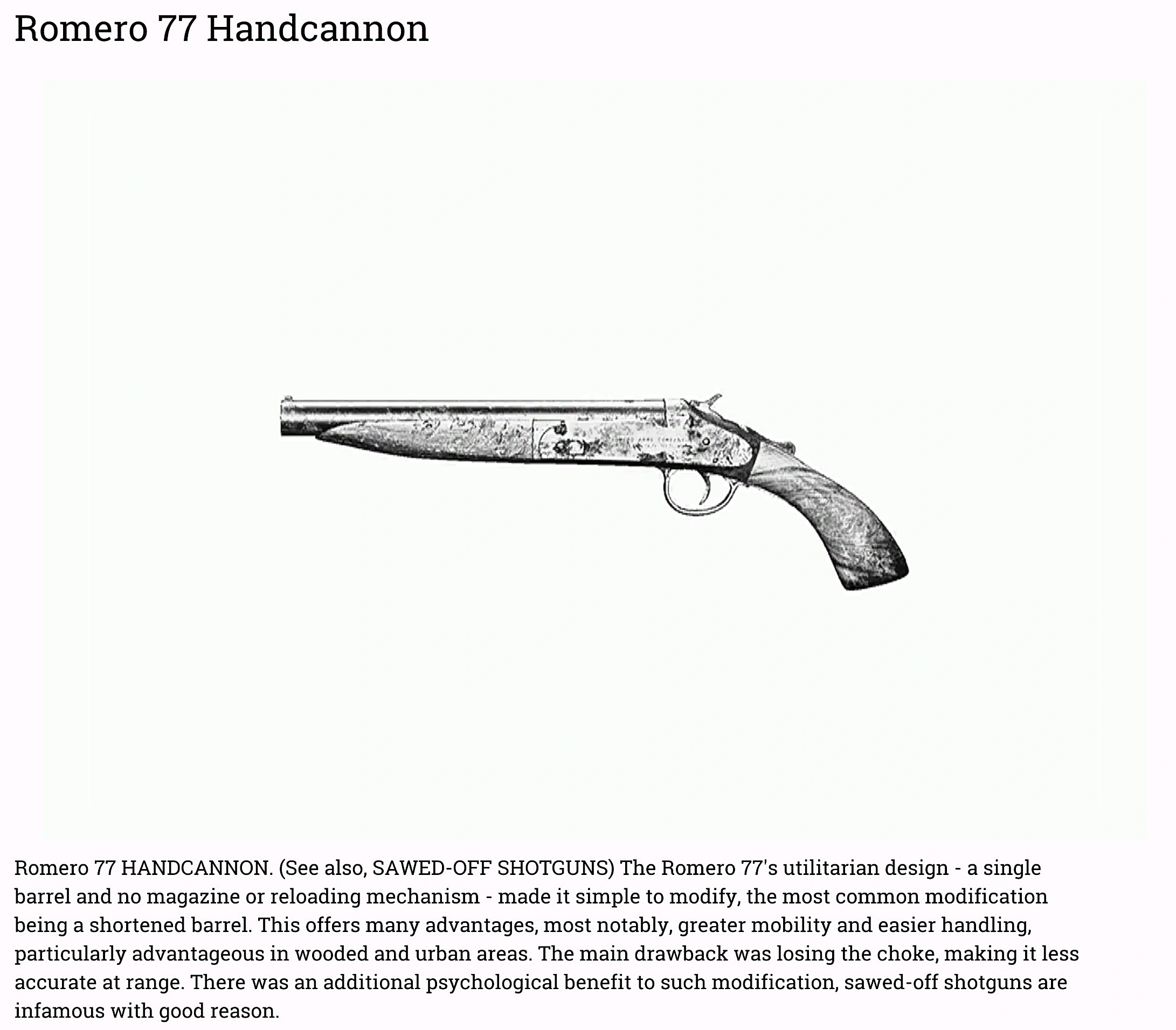 Sawn-off, break-action, single barrel shotgun. Easier to handle in tight spaces. Less accurate than its bigger cousin, it still has the best range of all handcannons.