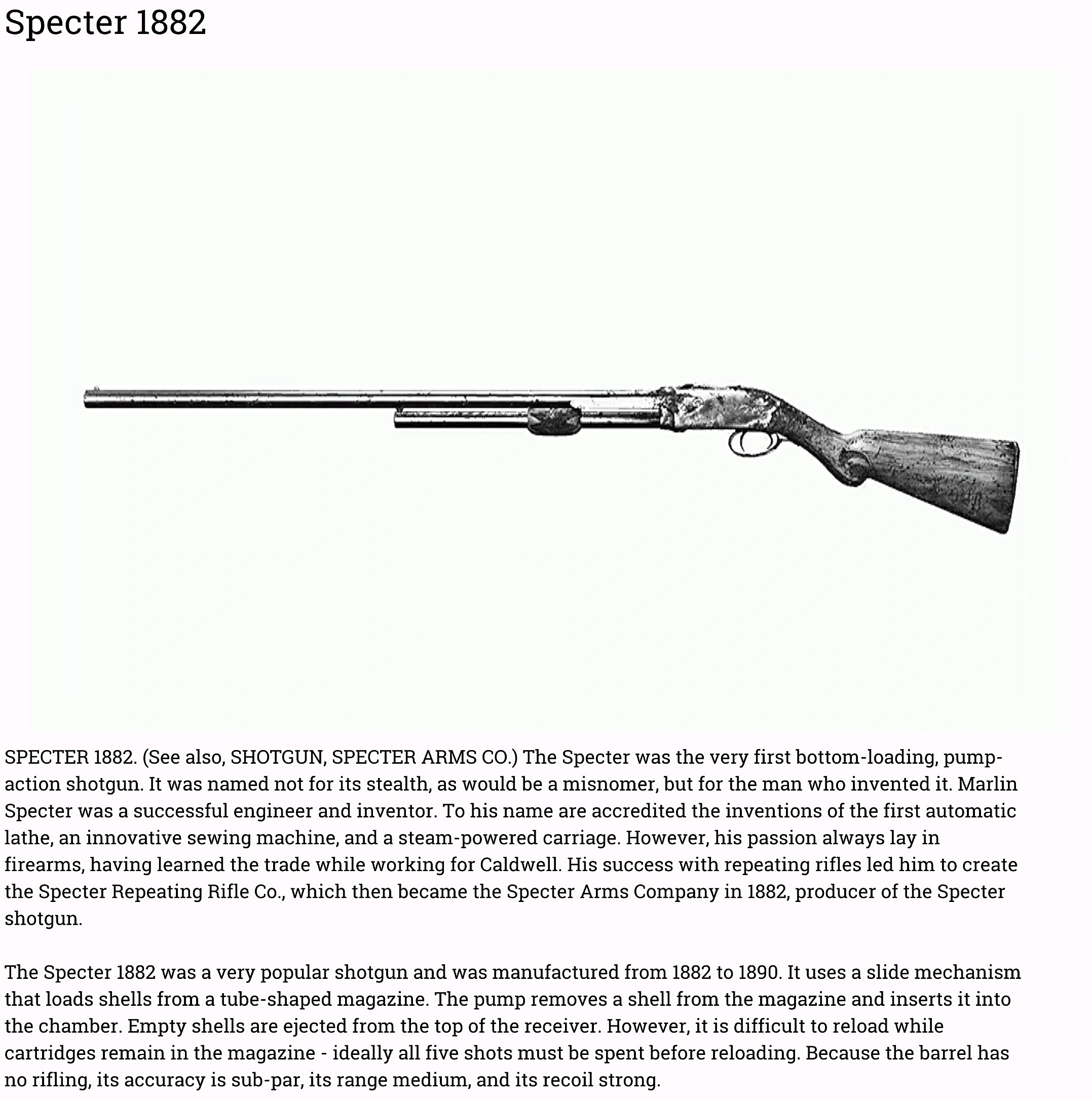 Revolutionary pump-action shotgun with long barrel, able to fire shells in rapid succession. Reloading the internal magazine takes time, due to its clunky, unrefined loading sequence.